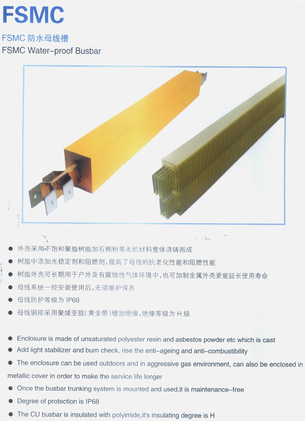FSMC防水性母線槽外殼采用不飽和聚脂樹(shù)脂加石棉粉等無(wú)機(jī)材料整體澆鑄而成;樹(shù)脂中添加光穩(wěn)定劑和阻燃劑,提高了母線的抗老化性能和阻燃性能;樹(shù)脂外殼可長(zhǎng)期用于戶外及有腐蝕性氣體環(huán)境中,也可加制金屬外殼更能延長(zhǎng)使用壽命;母線系統(tǒng)一經(jīng)安裝使用后,無(wú)須維護(hù)保養(yǎng);母線防護(hù)等級(jí)為|P68;母線銅排采用聚烯亞胺(黃金帶)增加絕緣,絕緣等級(jí)為H級(jí)。